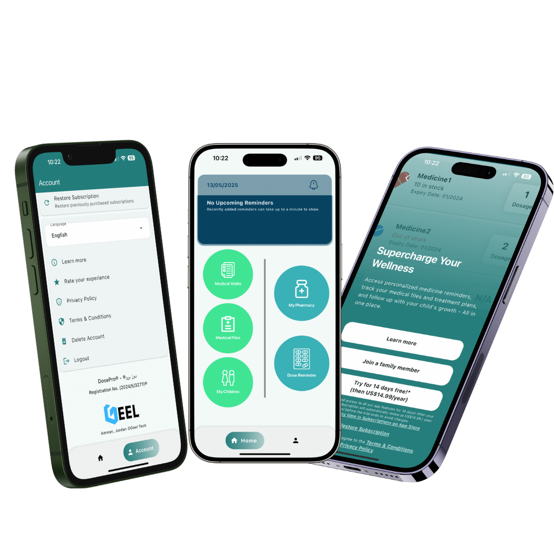 صارت مسؤولية الأدوية والمواعيد أسهل بكثير! مع تطبيق DosePro®️، ما بتنسى ولا جرعة، ولا موعد دكتور، ولا تطعيم لأولادك. التطبيق بيساعدك تدير كل شي بسهولة: تذكير ذكي بمواعيد الأدوية حسب جدولك. متابعة تطعيمات الأطفال ومراحل نموهم. تنظيم زيارات الطبيب لكل فرد بالعيلة. كل هاي الميزات بتشتغل مع اشتراك DosePro Premium، عشان تكون مطمّن ومتابع دايمًا. حمّل التطبيق وخلي DosePro®️ يهتم بتفاصيل صحتك.